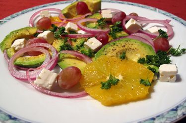 Schep de ui om met 2 eetlepels citroensap en laat even staan. Snijd de avocado's in dunne plakjes en besprenkel ze met 4 eetlepels citroensap, peper en zout. Snijd de oranje schil ruim van de sinaasappels, zodat je ook de witte schil erafsnijdt. Snijd de sinaasappel nu in plakken. Klop een dressing van de mosterd, de honing en de olie, breng hem op smaak met zout en (versgemalen) peper. Schik de avocado met de sinaasappel en de ui op de borden en druppel de dressing erover. Bestrooi de salade met de feta, de peterselie en de druiven.