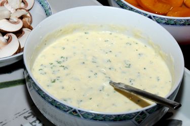 Meng de mayonaise met de Griekse yoghurt. Voeg de geperste teentjes knoflook toe. Op smaak maken met suiker, kerriepoeder, peper en een beetje zout. Tot slot de fijngesnipperde peterselie toevoegen.
