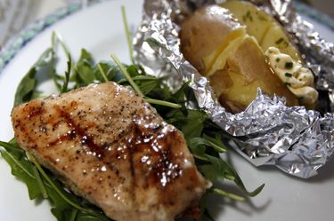Haal de kipfilet uit de oven en maak het pakketje voorzichtig open. Op dit moment moet je barbecue op temperatuur zijn, medium (ongeveer 250 graden).