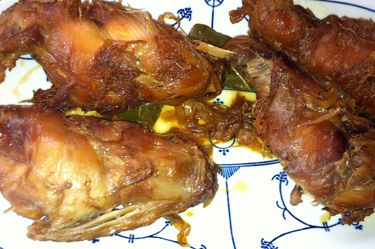 Bak het vlees aan in de boter, tot het een mooie bruine kleur heeft. Voeg dan de marinade toe, en laat het vlees een uurtje sudderen. Voeg dan de appelstroop toe, en controleer, als deze gesmolten is, de smaak. Is het geheel te zuur, strooi er dan enkele theelepels suiker in.
