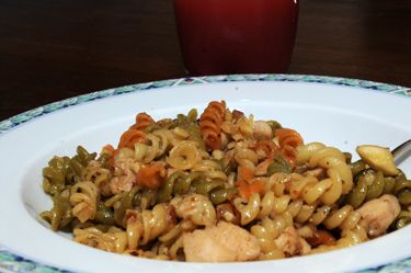 Giet de fusili af, en gooi deze bij de kip. Schep alles goed om, en voeg dan het noten/knoflook/olijfolie-mengsel toe.