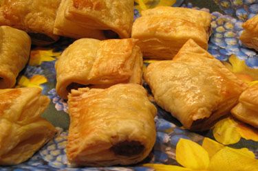 Verdeel in 10 gelijke stukjes en rol kleine worstjes van het gehakt, met de lengte van de bladerdeegvelletjes.