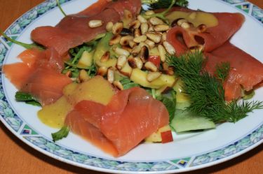 Maak tot slot het bord op: drapeer enkele komkommerlinten op het bord (hoe dunner gesneden, hoe mooier ze krullen). Vervolgens het rucola sla – appel mengsel. Leg de gerookte zalm er op. Maak het geheel af door het restant van de dressing er over heen te gieten en de pijnboompitjes er overheen te strooien. Garneer met enkele takjes verse dille.